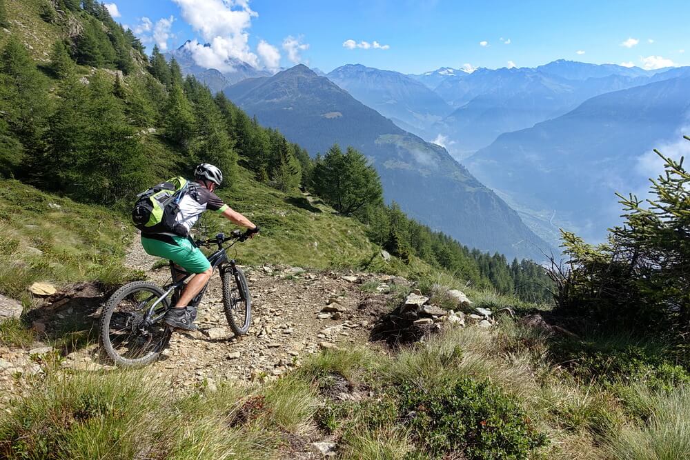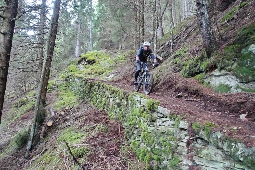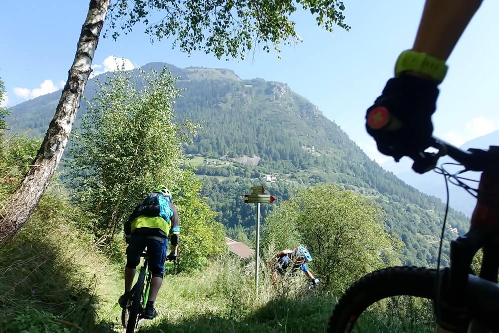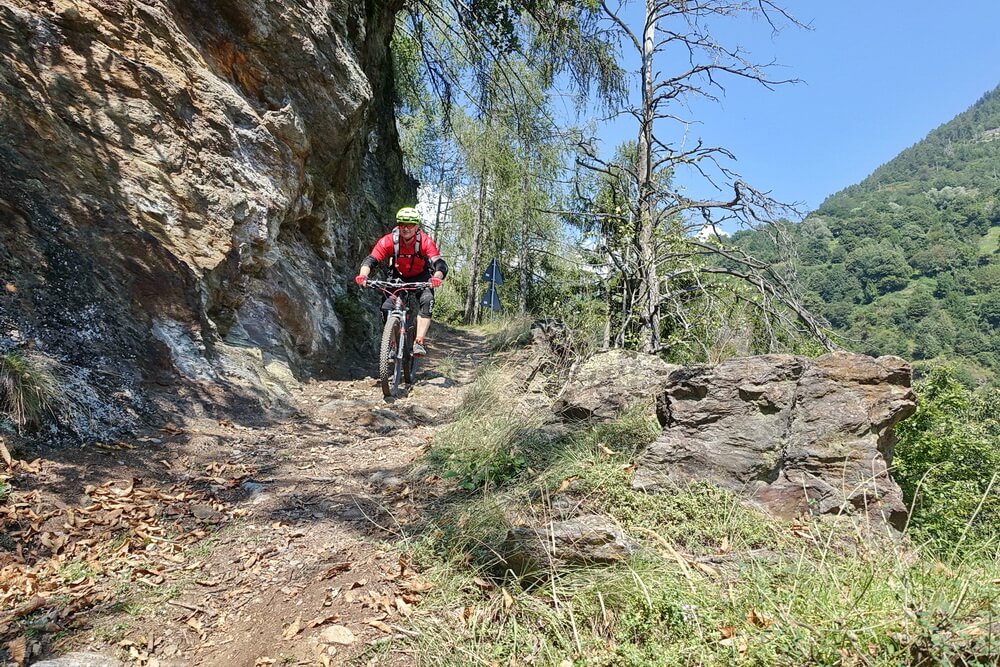 Beim Cornin Bike Trail ist das geschehen. Er startet in seiner längsten Ausprägung an der Ex-Alpe Forcoléta. Die liegt auf einer Höhe von 2029 Metern. Das Ende des Trails liegt in Grosotto liegt auf ca. 620 Metern. Da weiß man also, welche Arbeit auf einen wartet, sowohl bei der Auffahrt als auch bei der Abfahrt. Einen Shuttle zu benutzen ist durchaus sinnvoll, wenn man sich auf den Trail abwärts konzentrieren will.