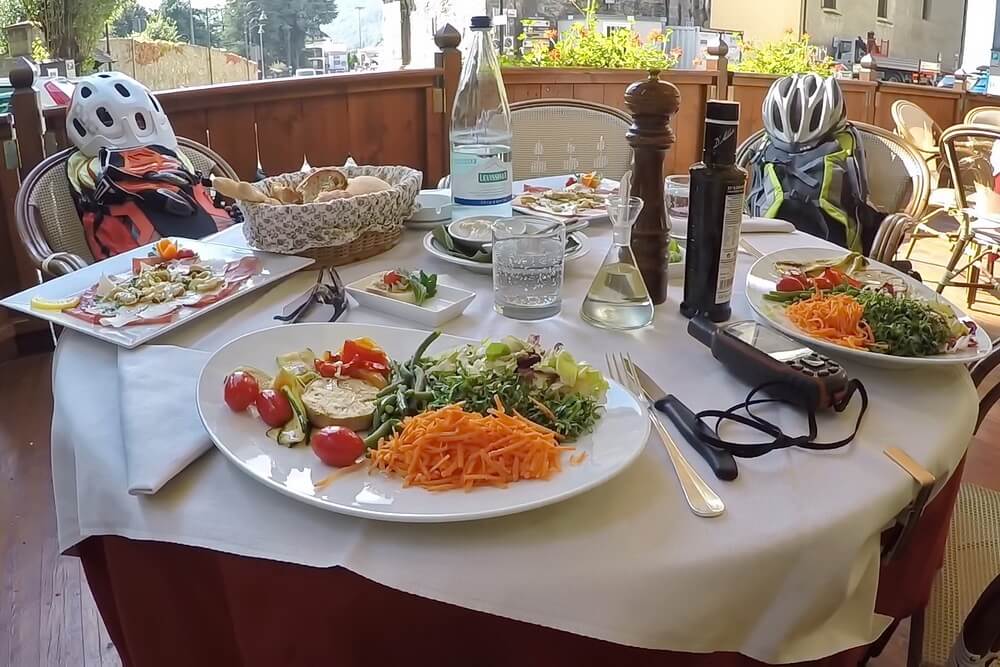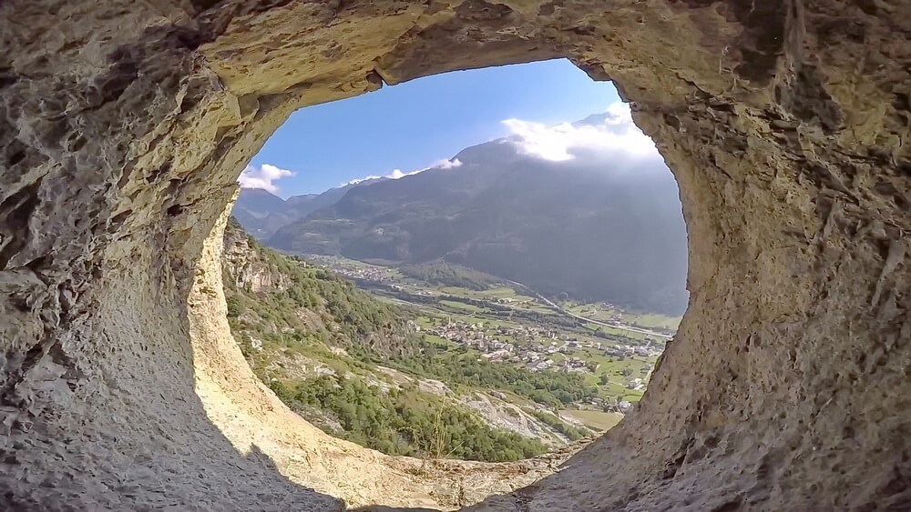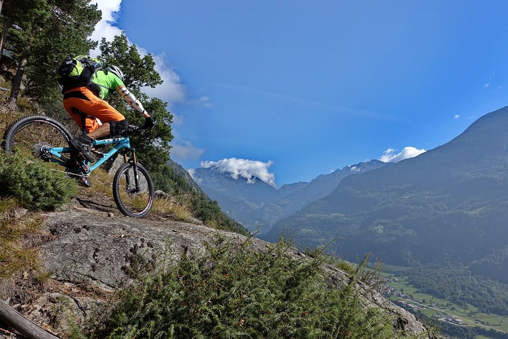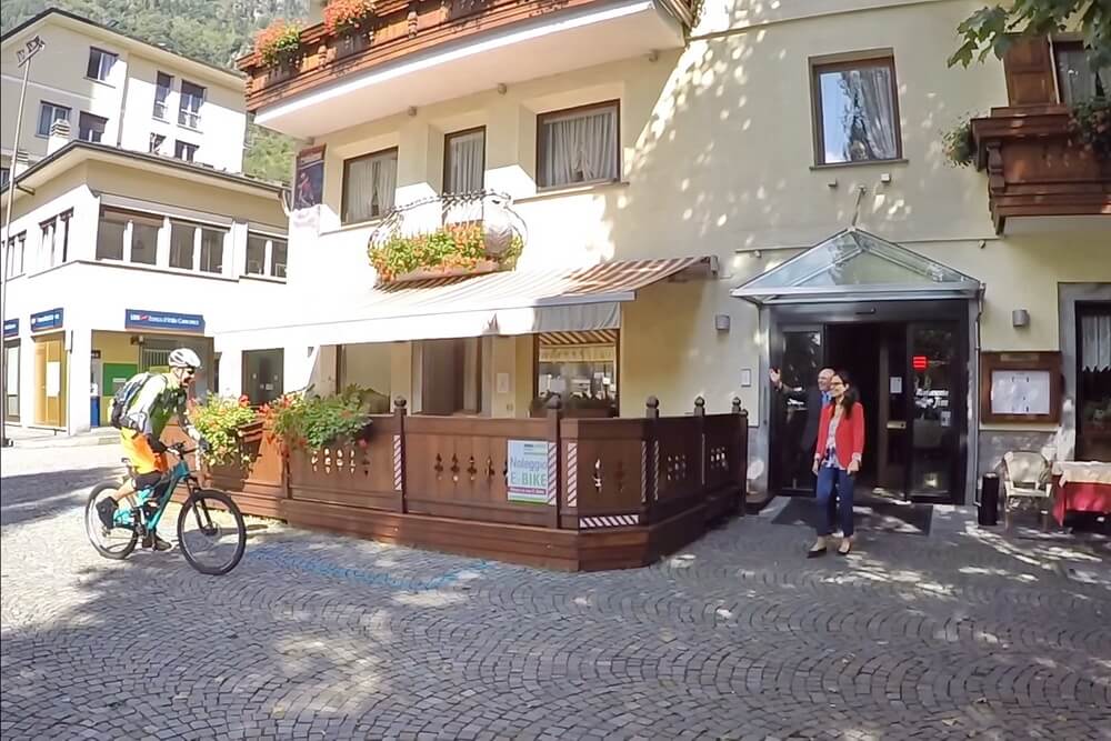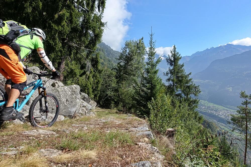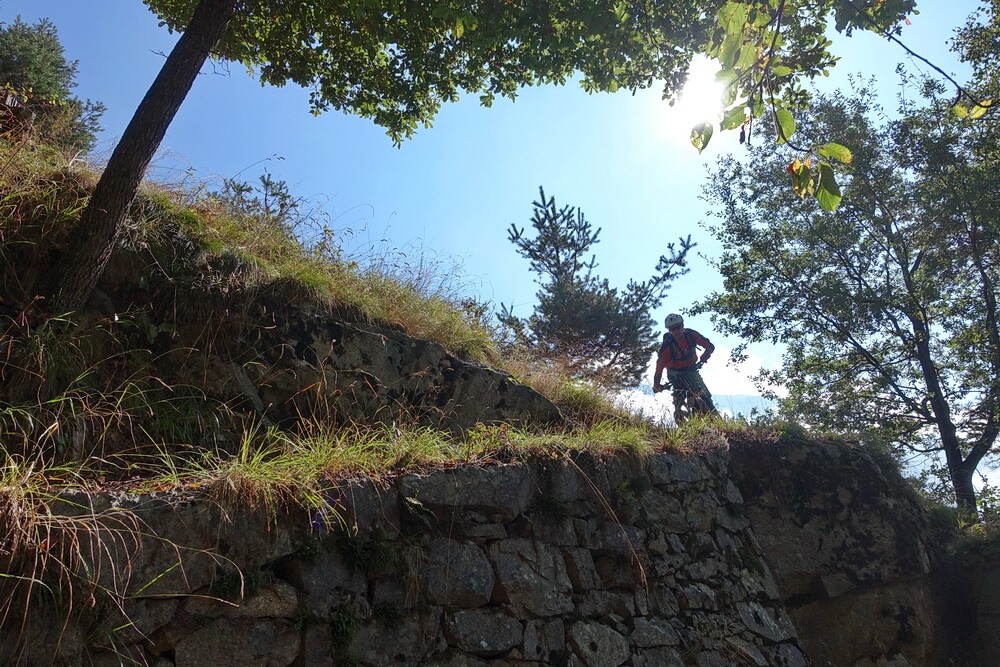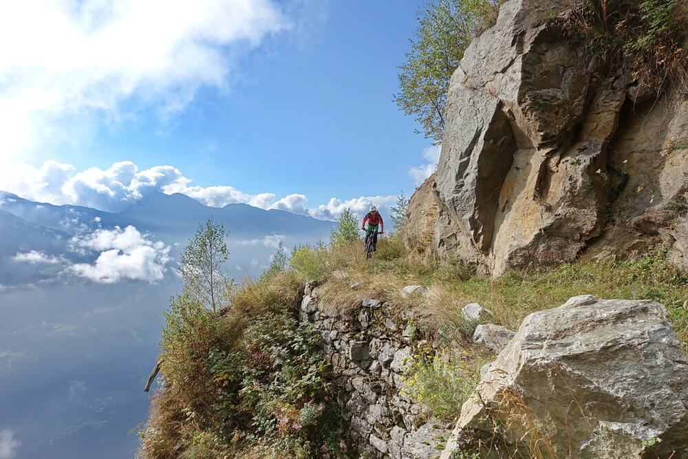Auch diese alte Geschützstellung gehört zur Linea Cadorna. Ein alter Militärtrail verbindet Grosio mit dem gut erhaltenen Unterstand. Von oben führt direkt von der La Grosina-Abfahrt bei Pra del Poda (1480 m) eine eindrucksvolle Militärpiste hinab. Ganz offensichtlich war diese für schwere Gerät geplant, so breit war sie damals angelegt worden. Der Zahn der Zeit hat sie schmaler gemacht, gut fahrbar ist sie trotzdem, auch wenn sie nicht ganz ohne leichte Gegenanstiege auskommt. Spektakulär wird dann der zweite Teil des Trails. Der führt dann zur besagten Stellung, die in den Berg hinein gebaut wurde. Wenn man es nicht weiß, kann man leicht daran vorbeifahren. Also Augen auf, das Bike abstellen und hineingehen. Erst nach einer dunklen Kurve öffnet sich der Raum und man blickt durch kreisrunde Bullaugen hinab ins Valtellina. Der weitere Trail hat anspruchsvolle Spitzkehren, die so eng am Fels liegen, dass mal selbst mit Hinterradversetzen kaum herum kommt. Aber das sind nur wenige Stellen und weiter geht es. Der Trail spuckt uns direkt in Grosio aus. Zeit für eine Rast im Hotel Sassella. Die Terrasse liegt einladend im Halbschatten. Für mich ist es wie nach Hause kommen.