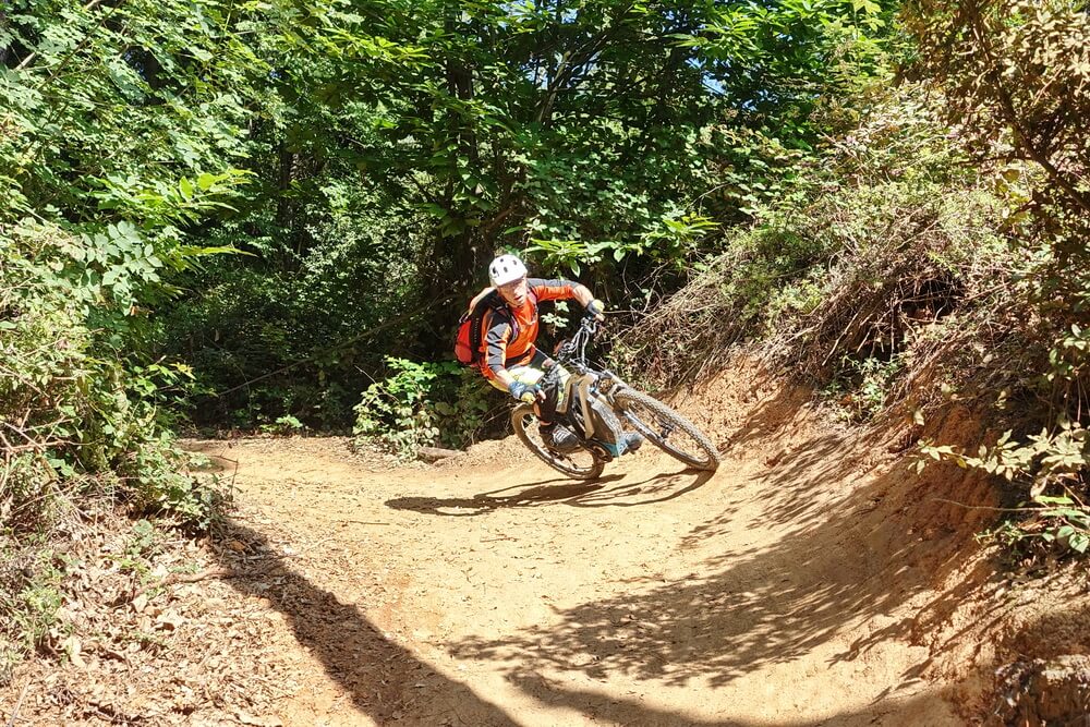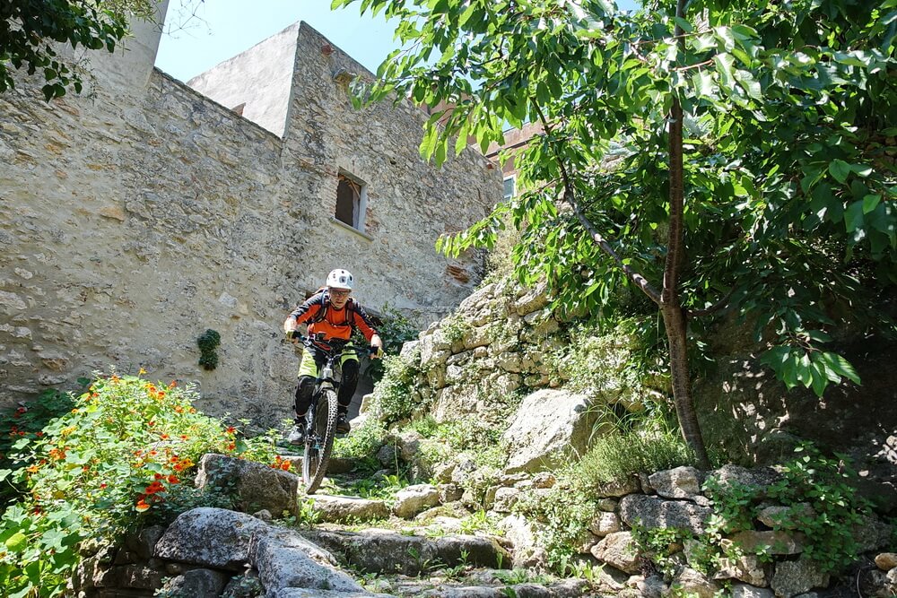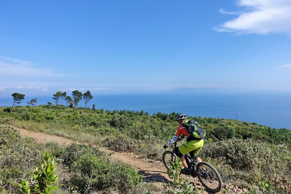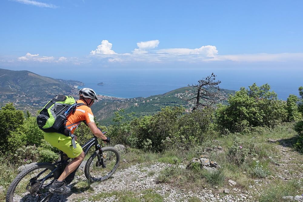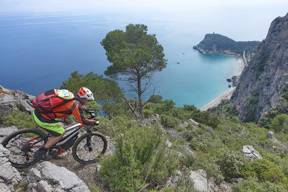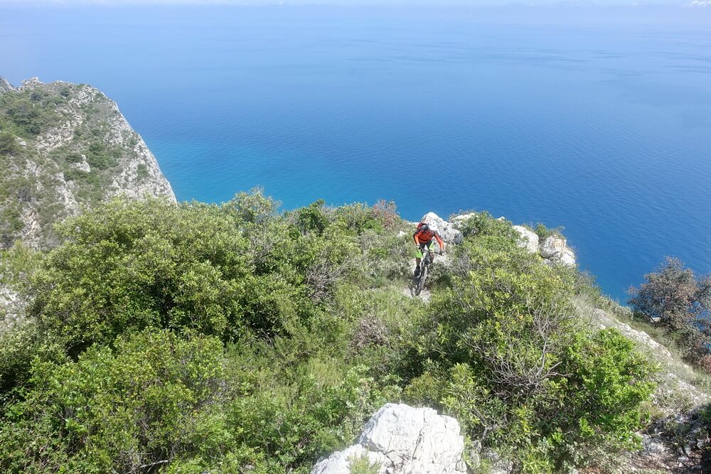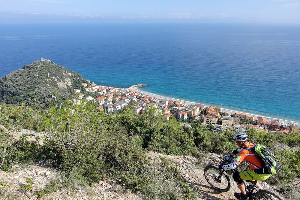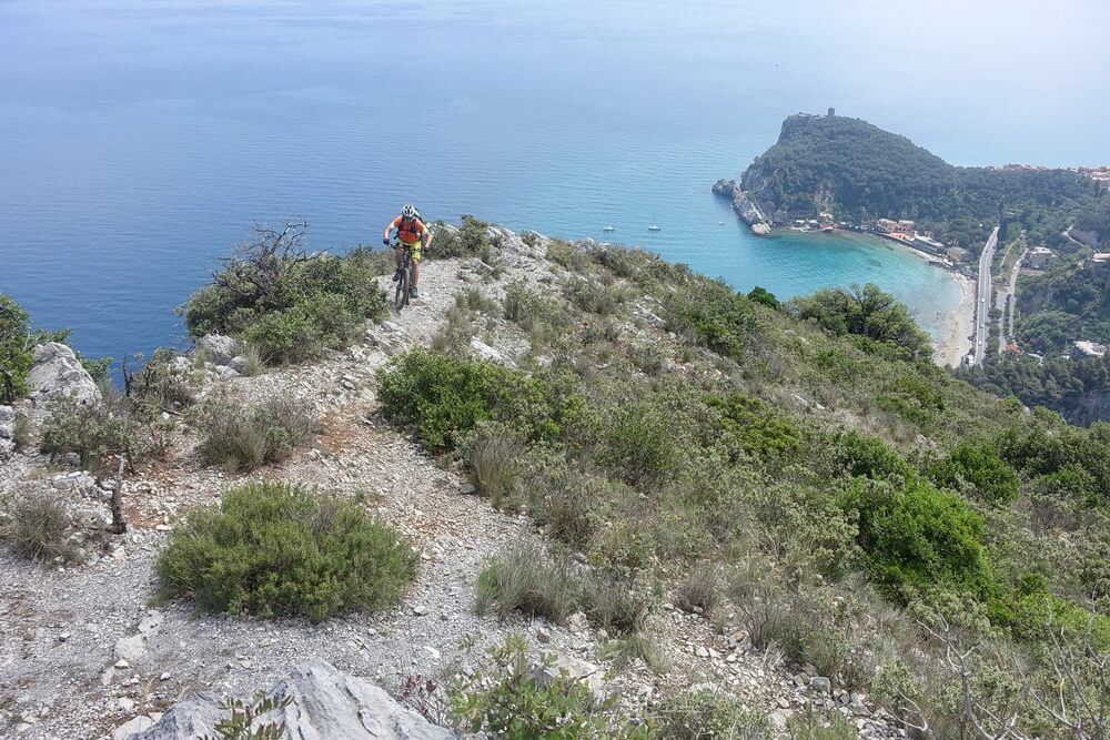 - Abfahrt auf Teilstrecke des Damendownhills mit sensationellen Blicken hinunter auf Varigotti (dort befinden sich die Fotospots von Finale Ligure schlechthin)