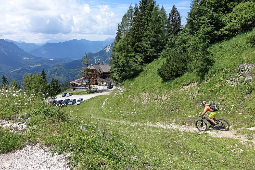 Bei unseren Ausfahrten mit dem eMTB steht eindeutig der Erlebniswert einer gemeinsamen Tour im Vordergrund und nicht die fahrtechnische Schwierigkeit der Strecke. Eine angenehme Fahrt in schöner Umgebung, garniert mit einem tollen Aussichtspunkt und einer schönen Hütteneinkehr - das macht uns beiden riesigen Spaß. Und ich habe überhaupt kein Problem damit, dass Simi die Schotterabfahrten betont langsam hinunterfährt und lieber einmal absteigt und ein Stück schiebt, als dass sie einen Sturz riskiert. An solchen Touren herrscht im Salzkammergut kein Mangel. Das hatte ich im Vorfeld recherchiert, als ich an einem eMTB-Camp im Narzissenhotel in Bad Aussee teilgenommen hatte. Das ist eindeutig eine Stärke des Salzkammergutes, dass es eine Vielzahl von leichten eMTB-Touren gibt, die für unsere beschriebene Paarkonstellation gerade ideal ist. Da mögen andere mosern, wie sie wollen, weil z.B. die Dachsteinrunde zu wenig Trails enthalte.