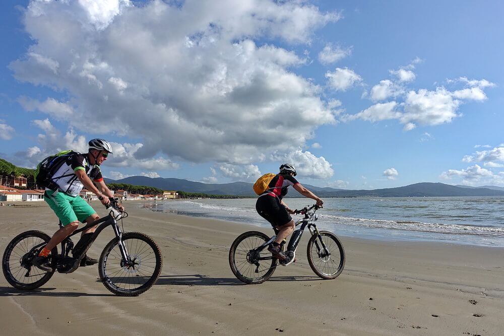 Wir haben die Gegend mit vollgefederten eMTB erkundet: Flyer Uproc 6 und Haibike Xduro ALLMTN RX. Damit ist man gewappnet, um leichte und anspruchsvollere Trailtouren rund um Massa Vecchia zu fahren. Unsere erste Tour führte uns an den Strand bei Follonica - in der Nachsaison im Oktober menschenleer. Es ist eine schöne leichte Tour an die toskanische Küste. Sie führt durch Olivenhaine im Hinterland in Richtung Follonica. Auf dem Rückweg passiert man eine charakteristische toskanische Zypressenallee. Ab Valpiana kann man bei der Rückfahrt auch den breiten Seitenstreifen der Straße benutzen.
