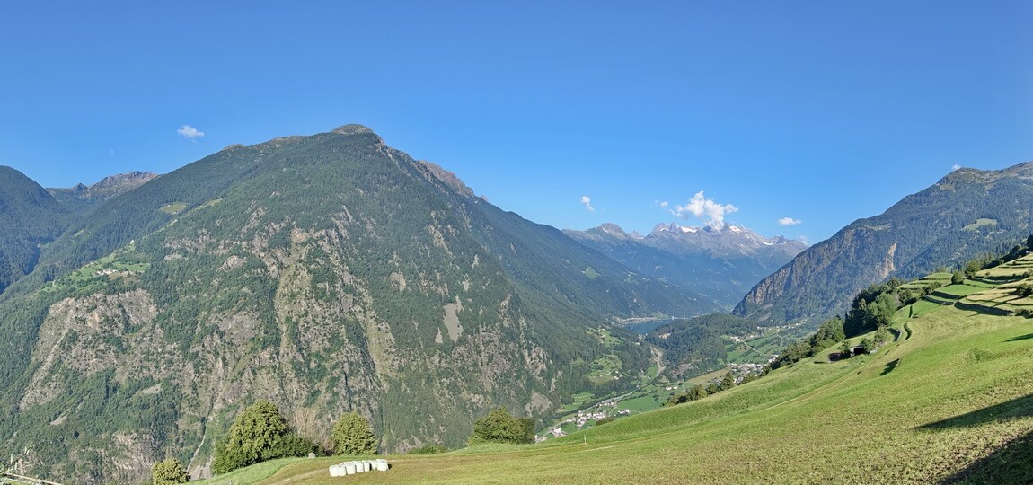 Ich habe mein Quartier bei meinem Freund Bruno Raselli in seinem gleichnamigen Sporthotel aufgeschlagen. Zusammen mit ihm habe ich schon Touren in diesem bezaubernden Tal erkundet (diese sind veröffentlicht im Alta Rezia Trailguide 1). Bruno ist hier aufgewachsen, kennt jede Menschenseele und viele Geschichten. Das ist für mich immer spannend und macht die Region für mich unverwechselbar. Diesmal erkunden wir die Trails und Touren mit dem eMTB. Ein paar Ideen hatte ich schon auf Lager, neue sollten noch dazukommen. Dabei ist auch wieder mein bewährter Tourbegleiter Alex. Gefahren sind wir mit eMTB M1 Spitzing und Flyer Uproc6.