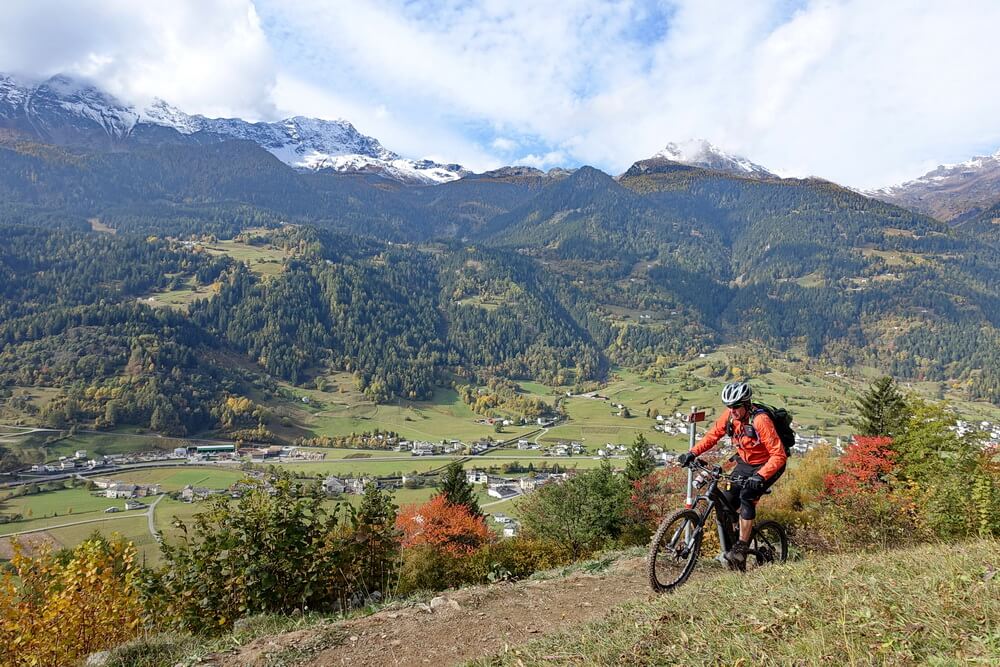 Ich habe mein Quartier bei meinem Freund Bruno Raselli in seinem gleichnamigen Sporthotel aufgeschlagen. Zusammen mit ihm habe ich schon Touren in diesem bezaubernden Tal erkundet (diese sind veröffentlicht im Alta Rezia Trailguide 1). Bruno ist hier aufgewachsen, kennt jede Menschenseele und viele Geschichten. Das ist für mich immer spannend und macht die Region für mich unverwechselbar. Diesmal erkunden wir die Trails und Touren mit dem eMTB. Ein paar Ideen hatte ich schon auf Lager, neue sollten noch dazukommen. Dabei ist auch wieder mein bewährter Tourbegleiter Alex. Gefahren sind wir mit eMTB M1 Spitzing und Flyer Uproc6.