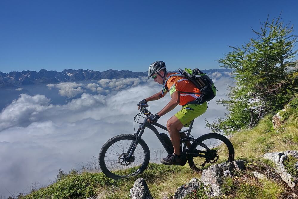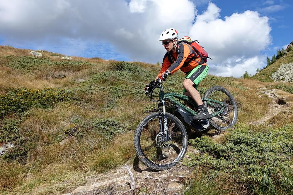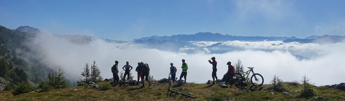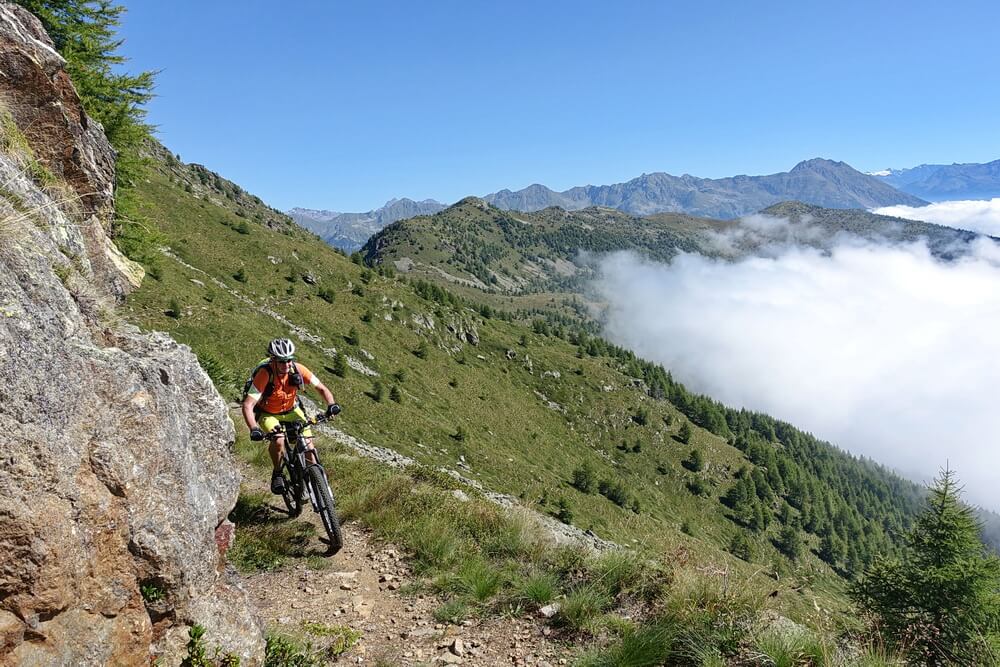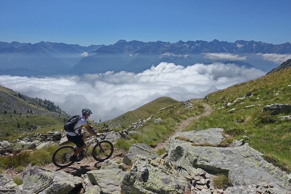 - nach kurzer Trailabfahrt vom Col d'Anzana beginnt der Höhentrail über der Baumgrenze in westlicher Richtung mit ein paar deftigen Gegenanstiegen (selbst mit eMTB nur mit Mühe fahrbar)